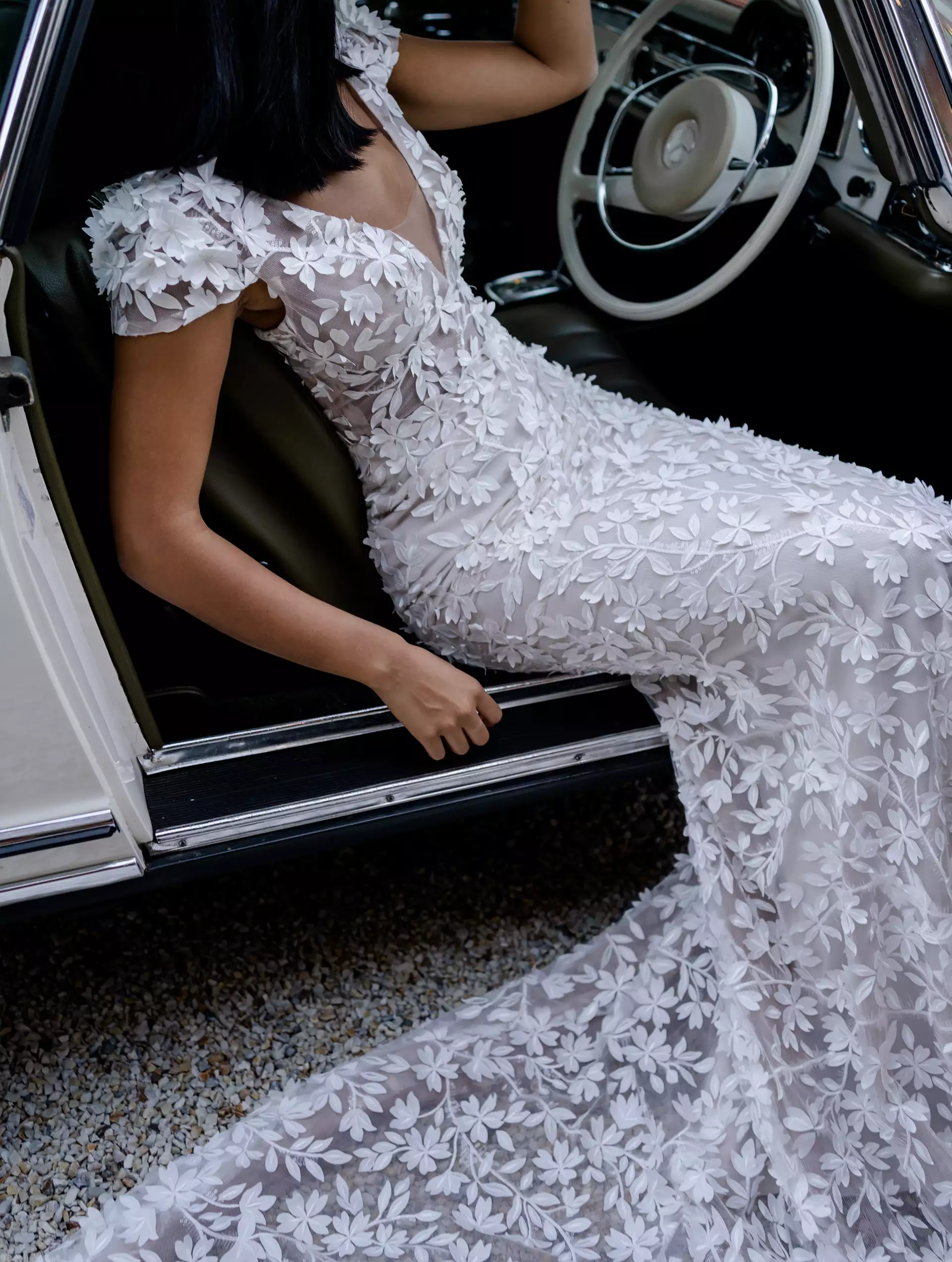 Darcy’s statement 3D floral lace is truly a show-stopper! This gorgeous, feminine design features a highly-requested cap sleeve with concentrated floral applique and our iconic, daring MWL plunging neckline. Darcy is perfect for brides looking to make a statement on their big day. Her figure-hugging pattern features a flattering godet in the skirt and the perfect low V-back. Darcy is available in ivory and pebble, with an original plunging neckline to the waistline or a 9cm higher neckline for a more modest cut.