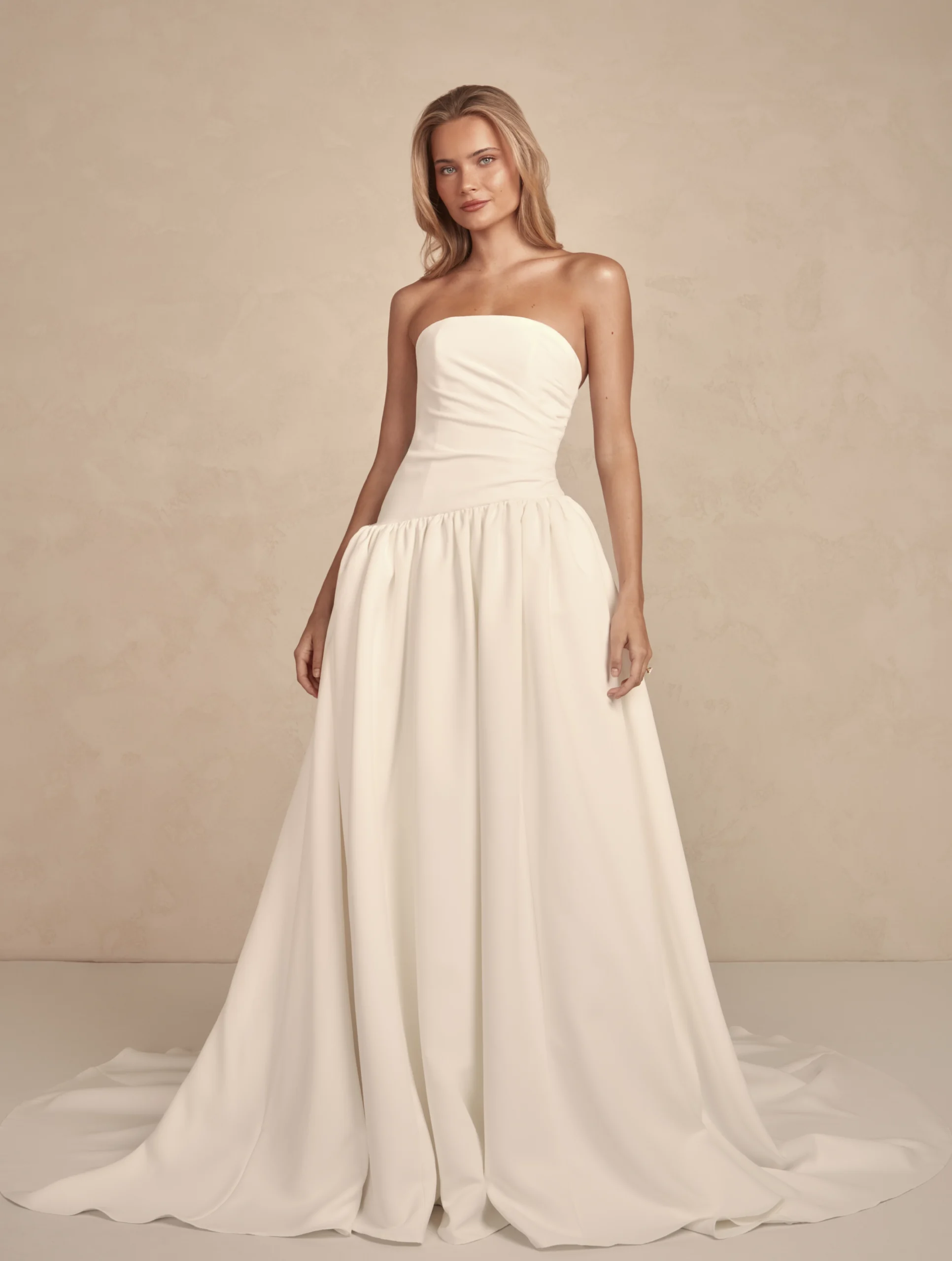 Avery features a sculptural silhouette, with an intentional asymmetrical waist complemented by a tailored strapless bodice. Creating a balance of romantic minimalism, Avery is masterfully draped in our brand-new matte duchess satin which is effortlessly soft and invokes luminous movement with every step.