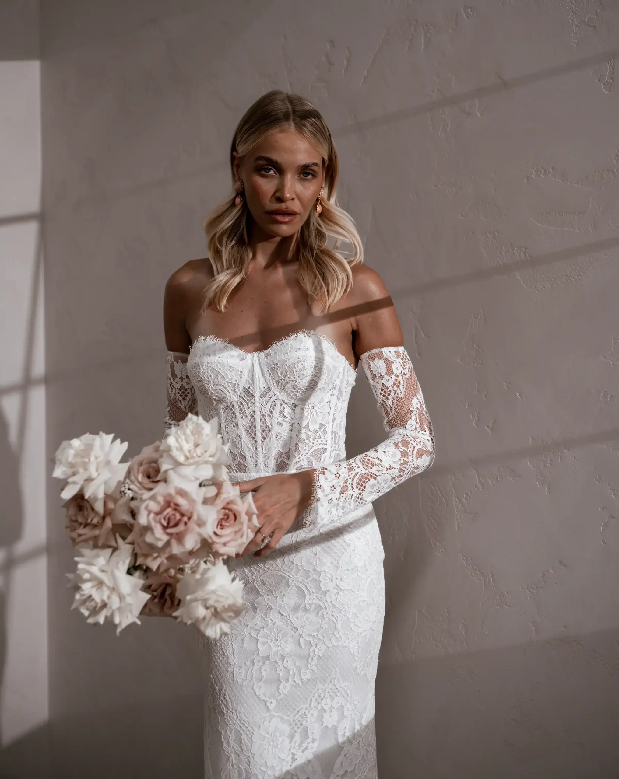 Her intricately beautiful Chantilly lace with stunning eyelash edges truly shines, regardless of the selected undertone. Paired with her sheer removable sleeves and contouring bodice boning, she is a beauty that is sure to endure the test of time, giving a nod to tradition, yet fiercely embraces modern trends.